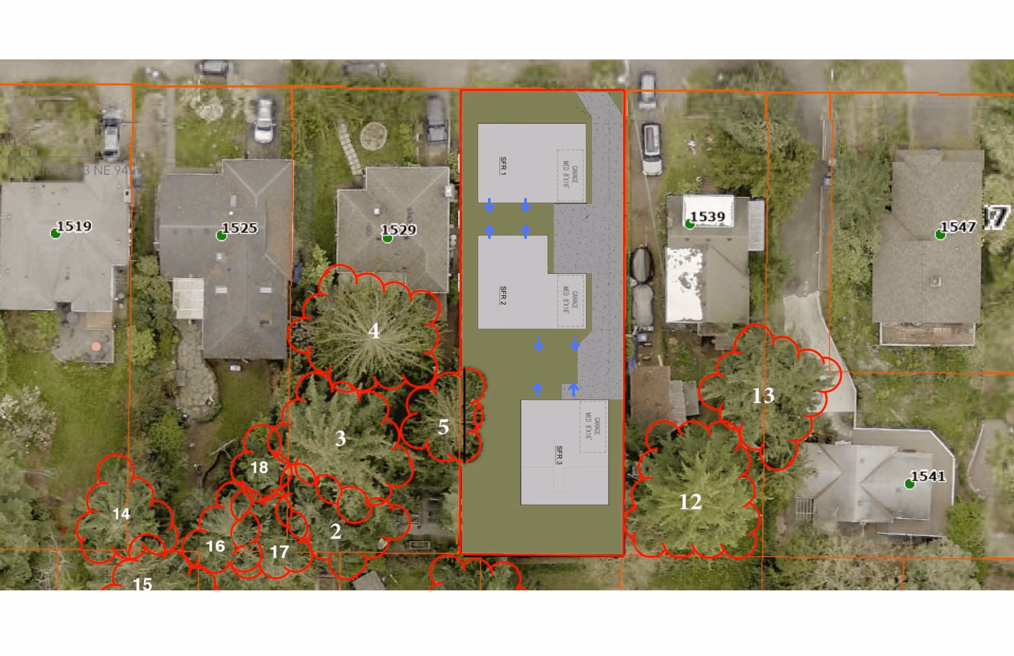 Greencity plans to use Seattle’s artificially large “tree protection area” loophole to clearcut every tree. And they’re counting on Seattle’s building department (SDCI) to approve their Lot Sprawl plan, which intentionally spreads structures to the edge of the lot and removes all trees. It’s a waste of space, but it results in higher sales prices on the new houses, bigger profits for the developer, and more revenue for SDCI. Even though this loophole was closed by Amendment 102, this project will be grandfathered in.