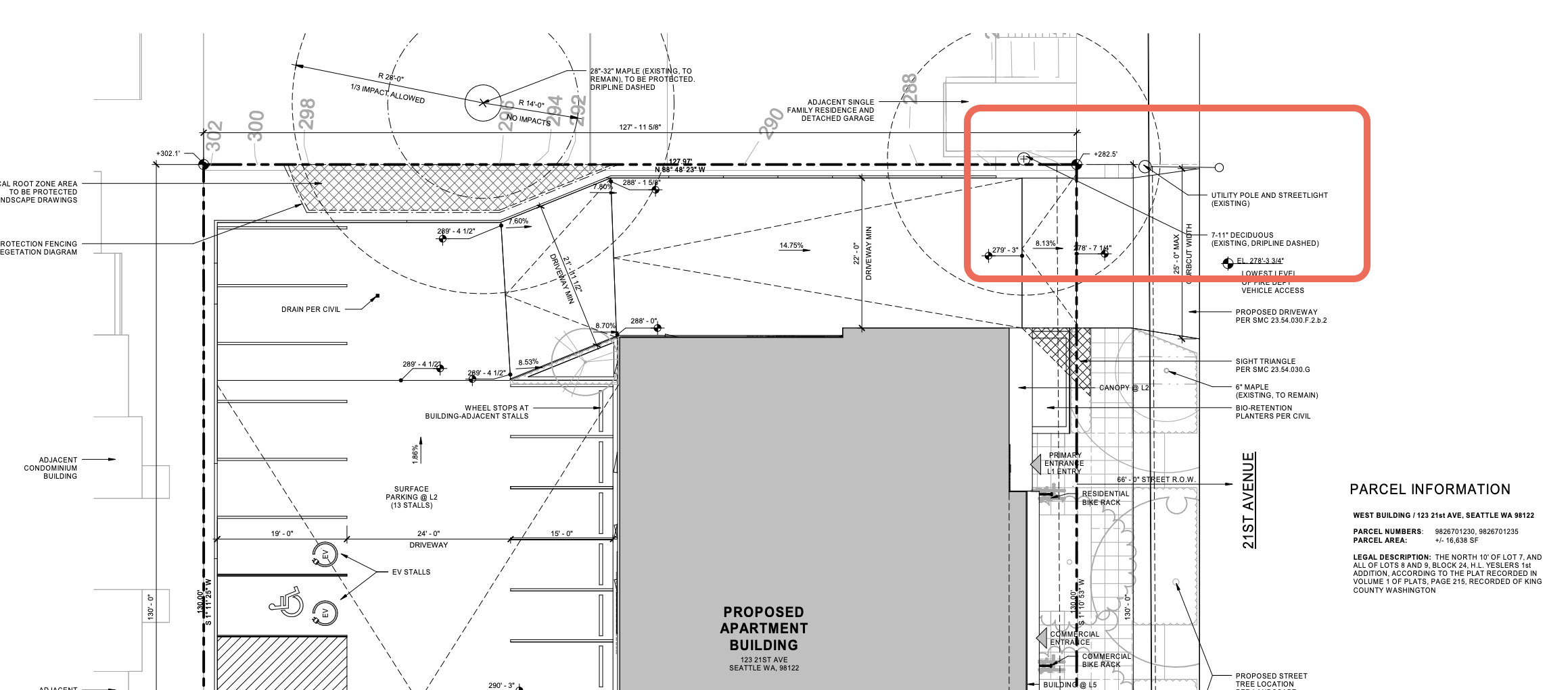 The Low Income Housing Institute (LIHI) is building a neighboring property to develop an apartment complex, fit with parking and a small commercial space. However, by virtue of adding this commercial space, the residence goes from a 10-foot driveway to a 22-foot driveway, endangering the root system of the Central District Black Walnut. Even just reducing the driveway by a few feet, to 17 feet, would support this tree.
